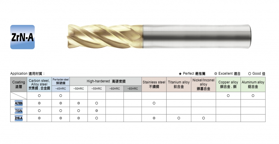 600 PLUS High Efficient End Mills Series, Diameter:2mm~12mm, Coating:Uncoated / ALTIBN / TiSiN / ZrN-A(Zirconia + AlTiBN)