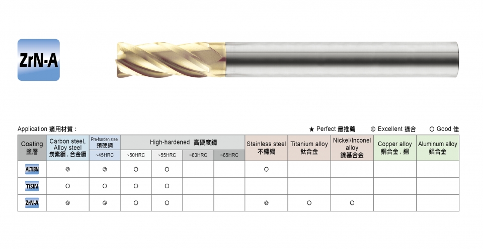 600PLUS High Efficient End Mills Series, Diameter:3mm~12mm, Coating: ALTIBN / TiSiN / ZrN-A(Zirconia + AlTiBN)