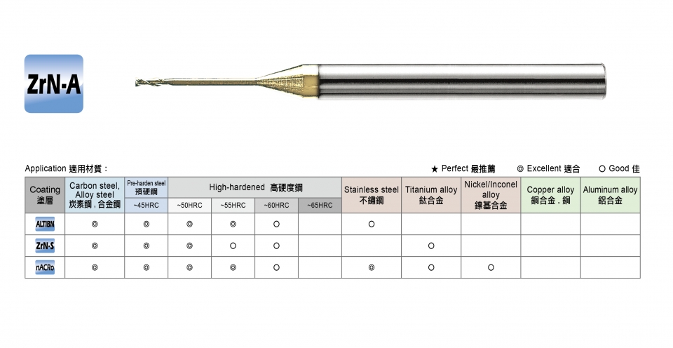 400 PLUS Nano End Mills,Diameter:0.5mm~4mm,Coating:ALTIBN/ ZrN-S/ nACRo