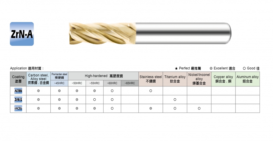 400 PLUS Nano End Mills,Diameter:1mm~25mm,Coating:ALTIBN/ ZrN-S/ nACRo