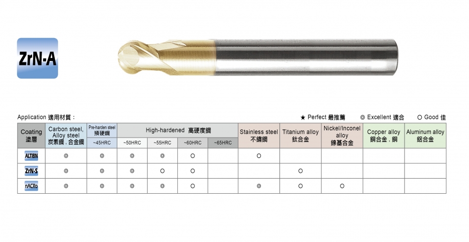 適用材料: ~HRC60/ 鐵材 / 素碳鋼 / 鑄鐵 / 模具鋼 / 合金鋼 / 工具鋼 / 熱處理鋼 / 焊補鋼料