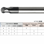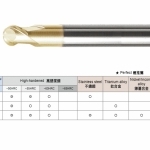 主要特性:極細微粒碳化鎢母材韌性高,被覆 n.B.S ,耐磨耗,非一般鈦鋁。專用於高速 M/C 高硬度高速切削,能對熱處理模具直接進行粗加工到細加工,減少換刀次數,提高機床稼動率,節省模具製作時程。