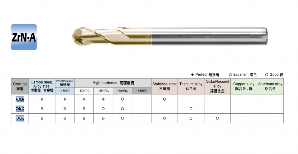 適用材料: ~HRC60/ 鐵材 / 素碳鋼 / 鑄鐵 / 模具鋼 / 合金鋼 / 工具鋼 / 熱處理鋼 / 焊補鋼料