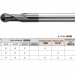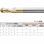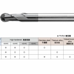 主要特性:極細微粒碳化鎢母材韌性高,被覆 n.B.S ,耐磨耗,非一般鈦鋁。專用於高速 M/C 高硬度高速切削,能對熱處理模具直接進行粗加工到細加工,減少換刀次數,提高機床稼動率,節省模具製作時程。