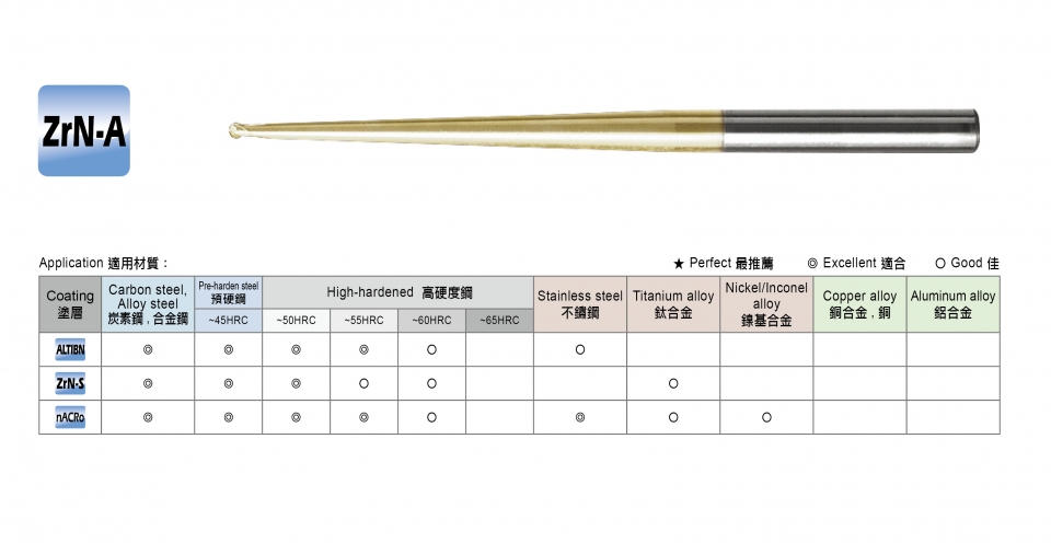 主要特性:極細微粒碳化鎢母材韌性高,被覆 n.B.S ,耐磨耗,非一般鈦鋁。專用於高速 M/C 高硬度高速切削,能對熱處理模具直接進行粗加工到細加工,減少換刀次數,提高機床稼動率,節省模具製作時程。