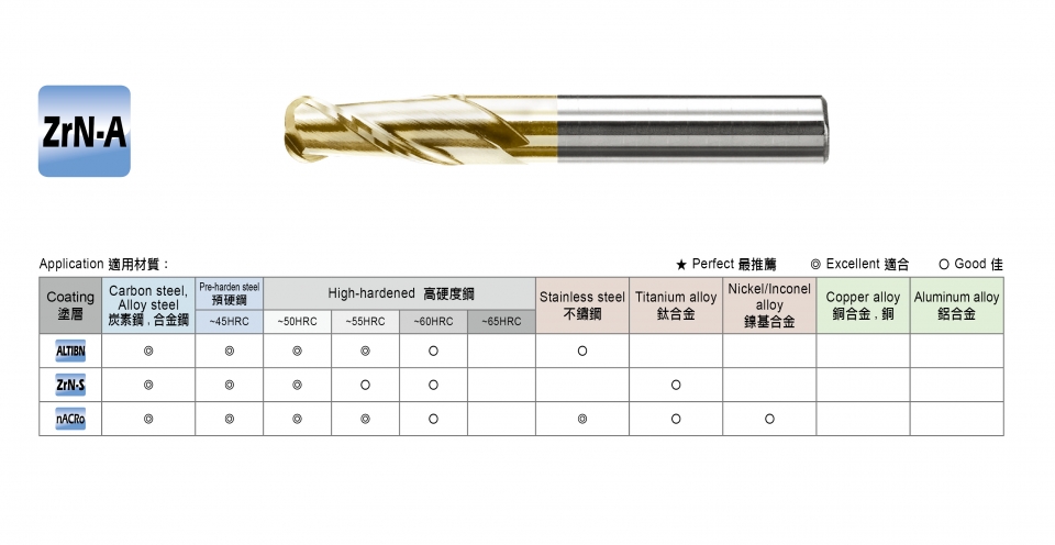 適用材料: ~HRC60/ 鐵材 / 素碳鋼 / 鑄鐵 / 模具鋼 / 合金鋼 / 工具鋼 / 熱處理鋼 / 焊補鋼料