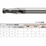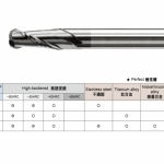 主要特性:極細微粒碳化鎢母材韌性高,被覆 n.B.S ,耐磨耗,非一般鈦鋁。專用於高速 M/C 高硬度高速切削,能對熱處理模具直接進行粗加工到細加工,減少換刀次數,提高機床稼動率,節省模具製作時程。