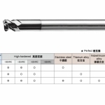 主要特性:極細微粒碳化鎢母材韌性高,被覆 n.B.S ,耐磨耗,非一般鈦鋁。專用於高速 M/C 高硬度高速切削,能對熱處理模具直接進行粗加工到細加工,減少換刀次數,提高機床稼動率,節省模具製作時程。