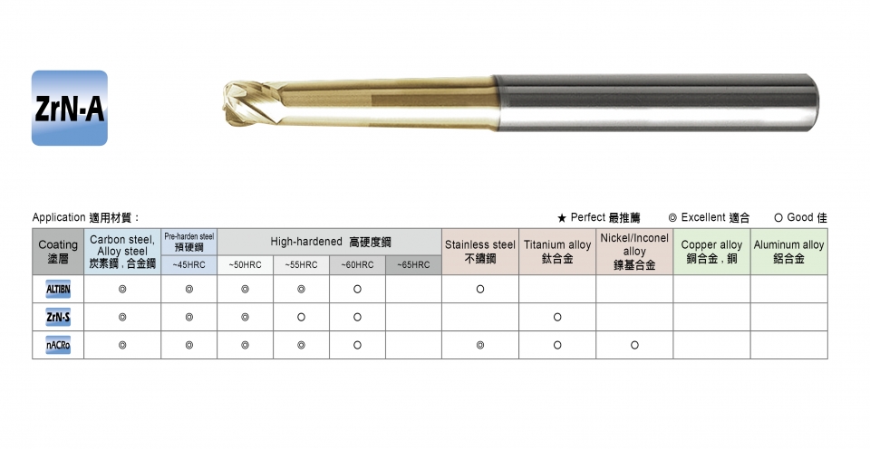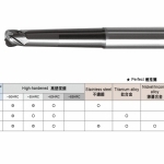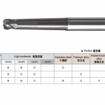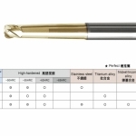 主要特性:極細微粒碳化鎢母材韌性高,被覆 n.B.S ,耐磨耗,非一般鈦鋁。專用於高速 M/C 高硬度高速切削,能對熱處理模具直接進行粗加工到細加工,減少換刀次數,提高機床稼動率,節省模具製作時程。
