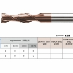 主要特性:奈米微粒碳化鎢母材韌性高,被覆 TiSiN,耐磨耗,非一般鈦鋁。 專用於高速 M/C 高硬度高速切削,能對熱處理模具直接進行粗加工到細加工,減少換刀次數,提高機床稼動率,節省模具製作時程。