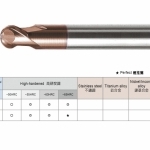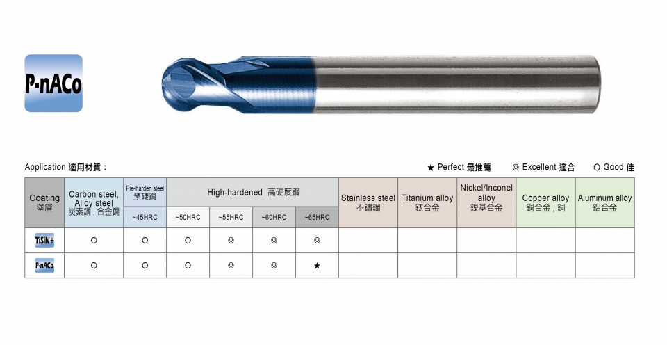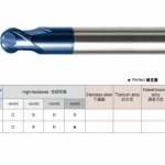 主要特性:奈米微粒碳化鎢母材韌性高,被覆 TiSiN,耐磨耗,非一般鈦鋁。 專用於高速 M/C 高硬度高速切削,能對熱處理模具直接進行粗加工到細加工,減少換刀次數,提高機床稼動率,節省模具製作時程。