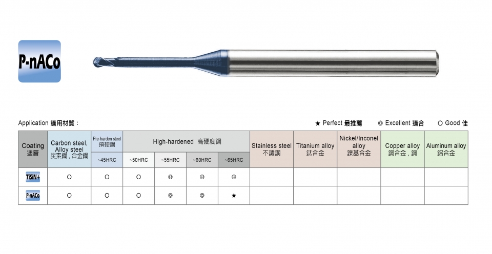 適用材料: ~HRC65/ 鐵材 / 素碳鋼 / 鑄鐵 / 模具鋼 / 合金鋼 / 工具鋼 / 熱處理鋼 / 焊補鋼料