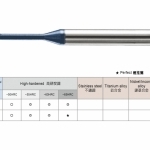 主要特性:奈米微粒碳化鎢母材韌性高,被覆 TiSiN,耐磨耗,非一般鈦鋁。 專用於高速 M/C 高硬度高速切削,能對熱處理模具直接進行粗加工到細加工,減少換刀次數,提高機床稼動率,節省模具製作時程。