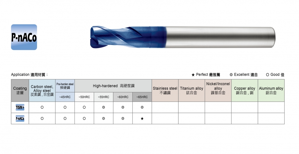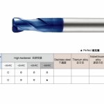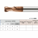 主要特性:奈米微粒碳化鎢母材韌性高,被覆 TiSiN,耐磨耗,非一般鈦鋁。 專用於高速 M/C 高硬度高速切削,能對熱處理模具直接進行粗加工到細加工,減少換刀次數,提高機床稼動率,節省模具製作時程。