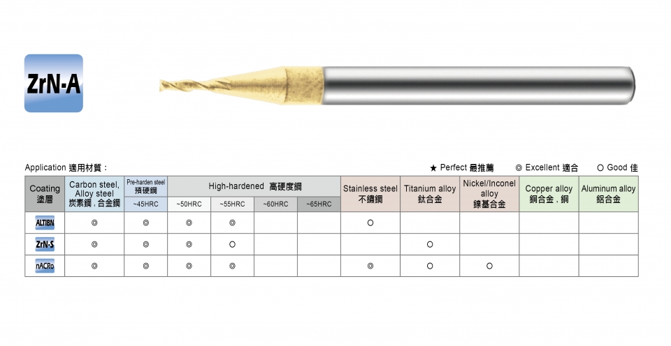 適用材料: ~HRC60/ 鐵材 / 素碳鋼 / 鑄鐵 / 模具鋼 / 合金鋼 / 工具鋼 / 熱處理鋼 / 焊補鋼料
