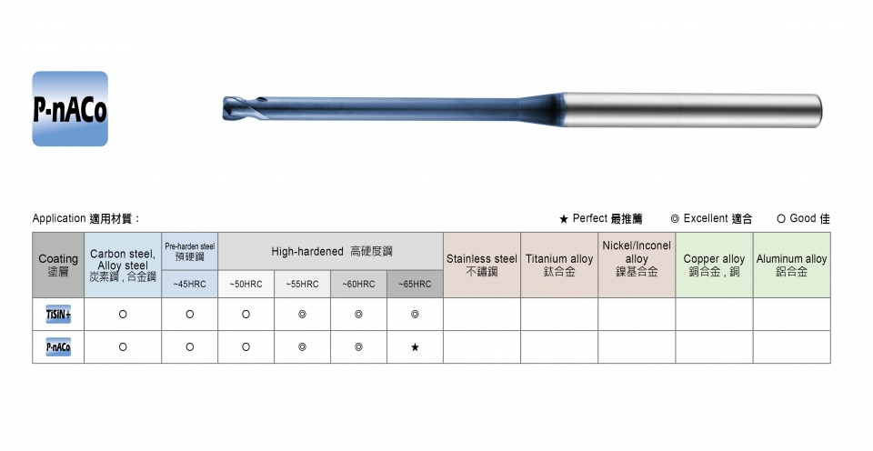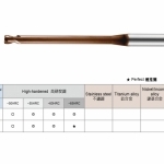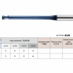 主要特性:奈米微粒碳化鎢母材韌性高,被覆 TiSiN,耐磨耗,非一般鈦鋁。 專用於高速 M/C 高硬度高速切削,能對熱處理模具直接進行粗加工到細加工,減少換刀次數,提高機床稼動率,節省模具製作時程。