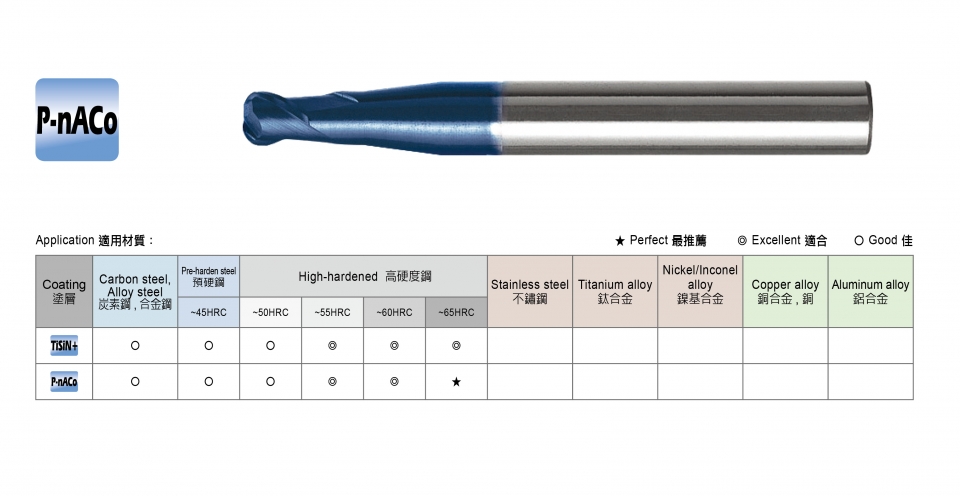 適用材料: ~HRC65/ 鐵材 / 素碳鋼 / 鑄鐵 / 模具鋼 / 合金鋼 / 工具鋼 / 熱處理鋼 / 焊補鋼料