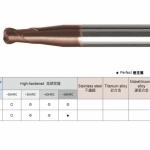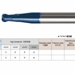 主要特性:奈米微粒碳化鎢母材韌性高,被覆 TiSiN,耐磨耗,非一般鈦鋁。 專用於高速 M/C 高硬度高速切削,能對熱處理模具直接進行粗加工到細加工,減少換刀次數,提高機床稼動率,節省模具製作時程。