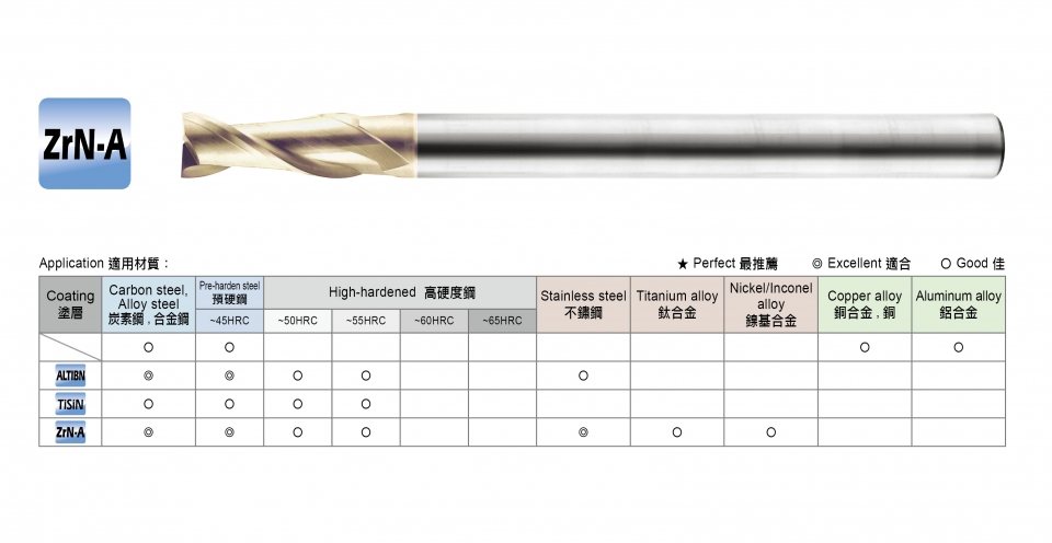 適用材料: ~45HRC/鐵材 / 素碳鋼 / 鑄鐵 / 模具鋼 / 合金鋼 / 鋁合金 / 工具鋼 / 熱處理鋼 / 焊補鋼料