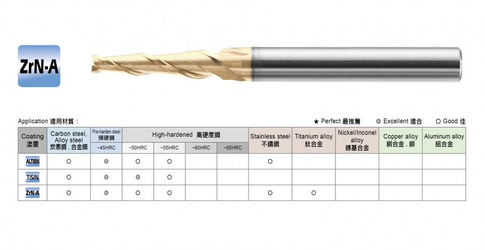 適用材料: ~45HRC/鐵材 / 素碳鋼 / 鑄鐵 / 模具鋼 / 合金鋼 / 鋁合金 / 工具鋼 / 熱處理鋼 / 焊補鋼料
