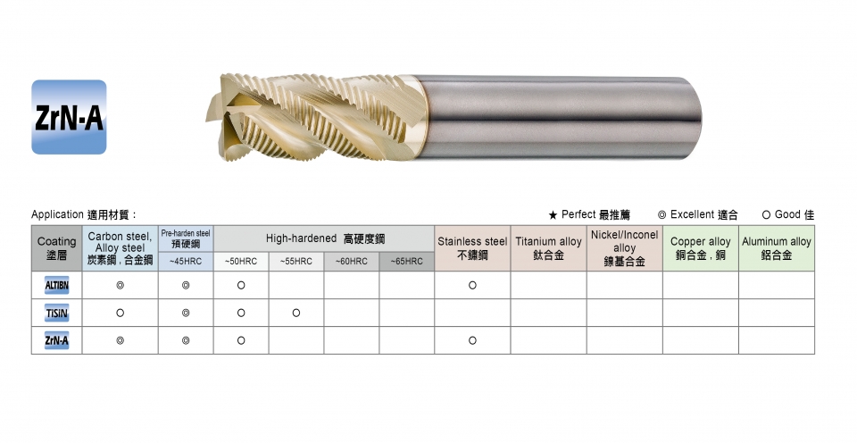 適用材料: ~45HRC/鐵材 / 素碳鋼 / 鑄鐵 / 模具鋼 / 合金鋼 / 鋁合金 / 工具鋼 / 熱處理鋼 / 焊補鋼料