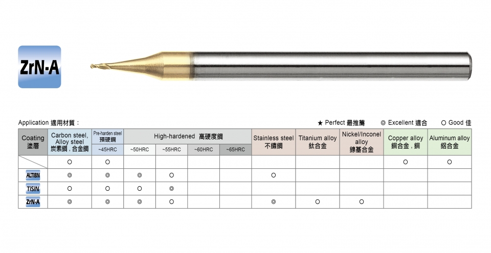 600 PLUS Nano End Mills Series, Diameter:0.3mm~3mm,Coating:ALTIBN / TiSiN / ZrN-A(Zirconia + AlTiBN)