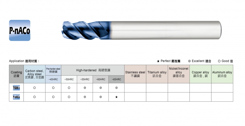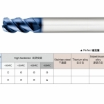 主要特性:奈米微粒碳化鎢母材韌性高,被覆 TiSiN,耐磨耗,非一般鈦鋁。 專用於高速 M/C 高硬度高速切削,能對熱處理模具直接進行粗加工到細加工,減少換刀次數,提高機床稼動率,節省模具製作時程。