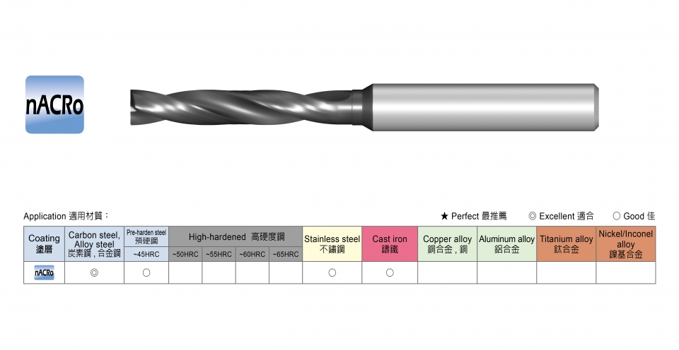 ~50HRCStainless steel Cast iron Titanium alloy Copper ally Aluminum ally nACRo ◎ ◎ ○ ○ ○ ZrN-A ○ ○ ◎ ○ ○ ○ ○