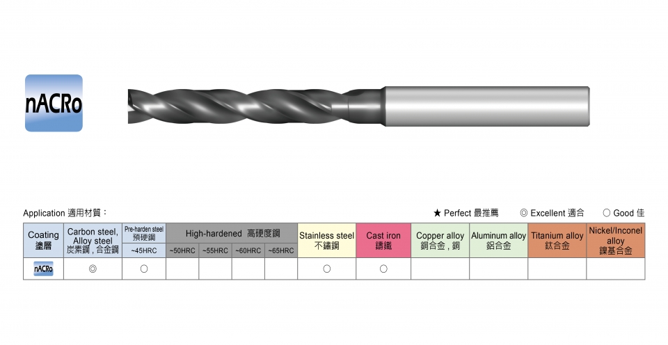 ~50HRCStainless steel Cast iron Titanium alloy Copper ally Aluminum ally nACRo ◎ ◎ ○ ○ ○ ZrN-A ○ ○ ◎ ○ ○ ○ ○