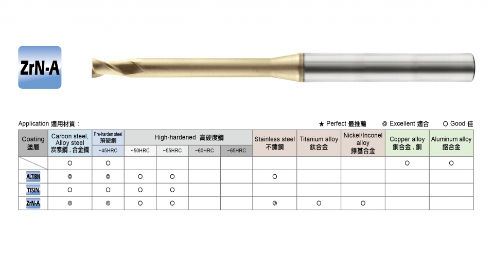 600 PLUS High Efficient End Mills Series, Diameter:0.5mm~4mm, Coating:Uncoated / ALTIBN / TiSiN / ZrN-A(Zirconia + AlTiBN)