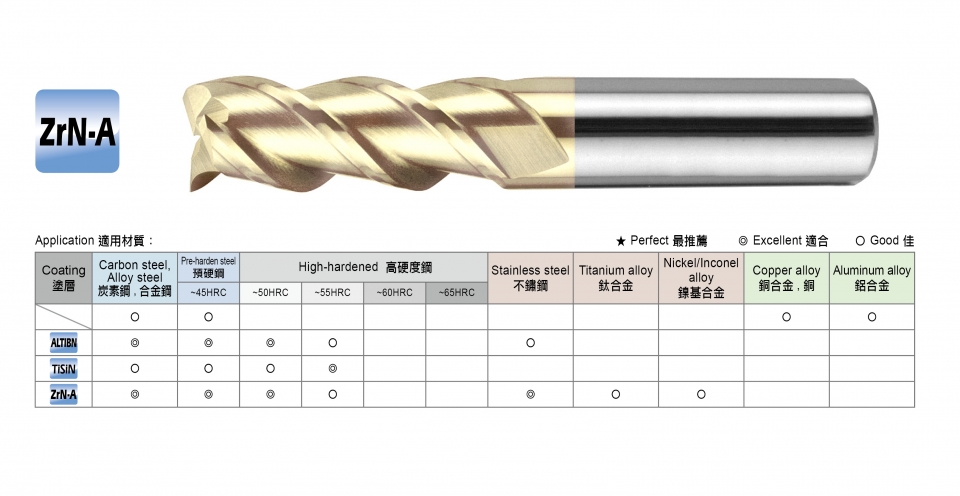 600 PLUS High Efficient End Mills Series, Diameter:1mm~20mm, Coating:Uncoated / ALTIBN / TiSiN / ZrN-A(Zirconia + AlTiBN)