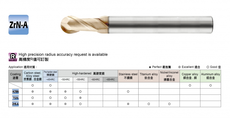 適用材料: ~50HRC / 鐵材 / 素碳鋼 / 鑄鐵 / 模具鋼 / 合金鋼 / 鋁合金 / 工具鋼 / 熱處理鋼 / 焊補鋼料