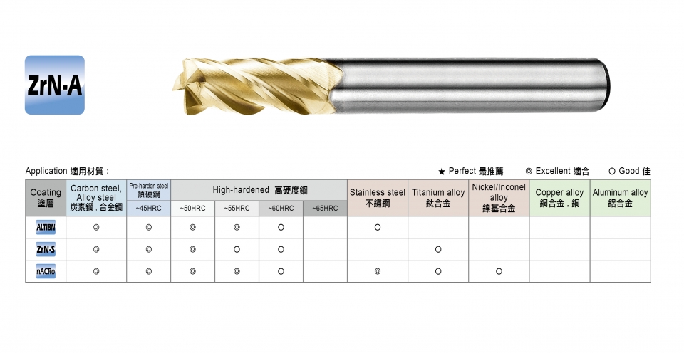 400 PLUS Nano End Mills,Diameter:3mm~12mm,Coating:ALTIBN/ ZrN-S/ nACRo