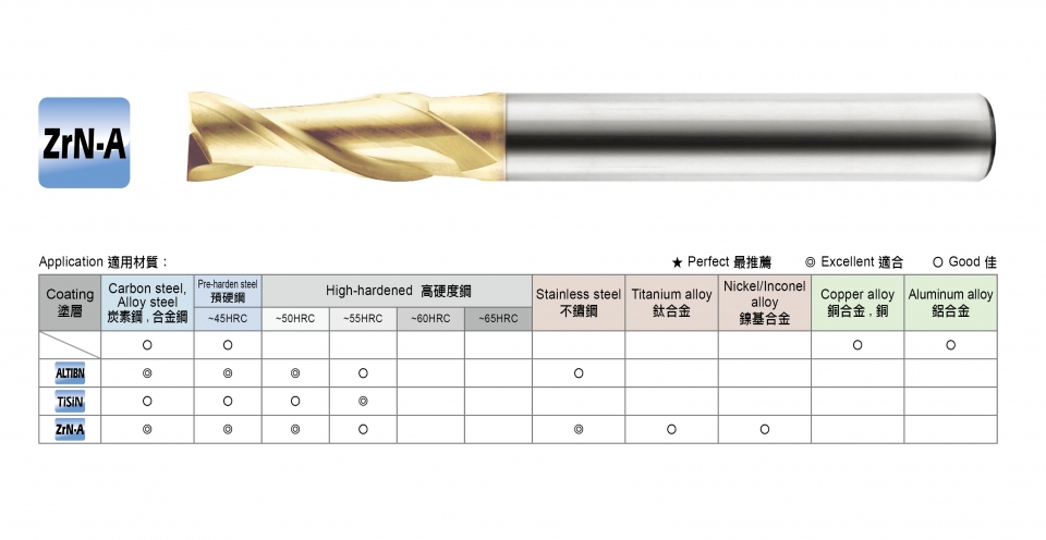 600 PLUS High Efficient End Mills Series, Diameter:1mm~20mm, Coating:Uncoated / ALTIBN / TiSiN / ZrN-A (Zirconia + AlTiBN)