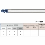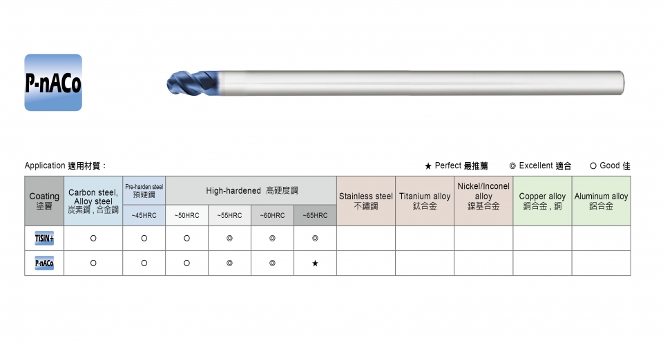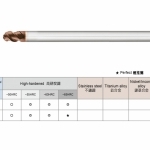 主要特性:奈米微粒碳化鎢母材韌性高,被覆 TiSiN,耐磨耗,非一般鈦鋁。 專用於高速 M/C 高硬度高速切削,能對熱處理模具直接進行粗加工到細加工,減少換刀次數,提高機床稼動率,節省模具製作時程。