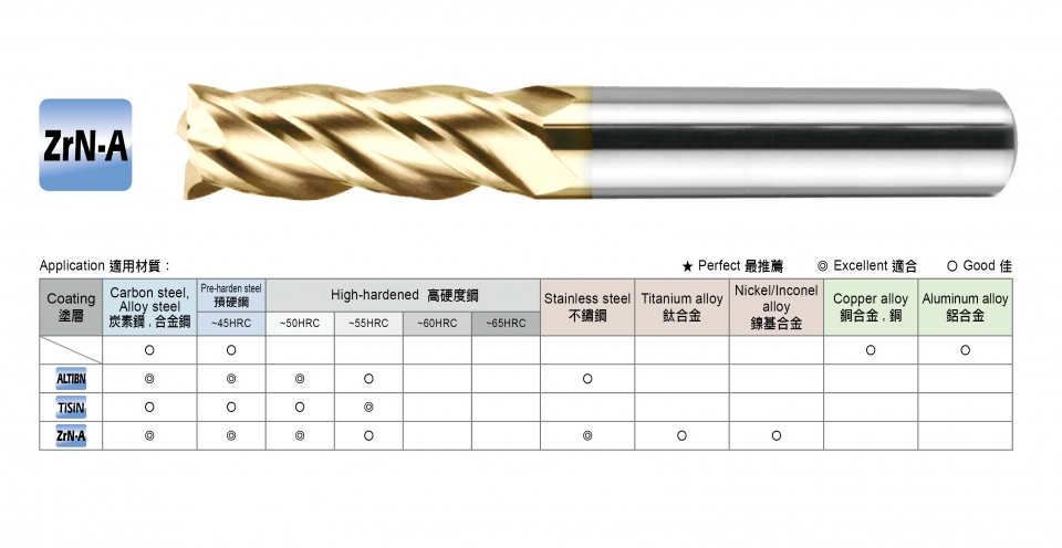 600 PLUS High Efficient End Mill Series, Diameter:1mm~20mm, Coating:Uncoated / ALTIBN / TiSiN / ZrN-A(Zirconia + AlTiBN)