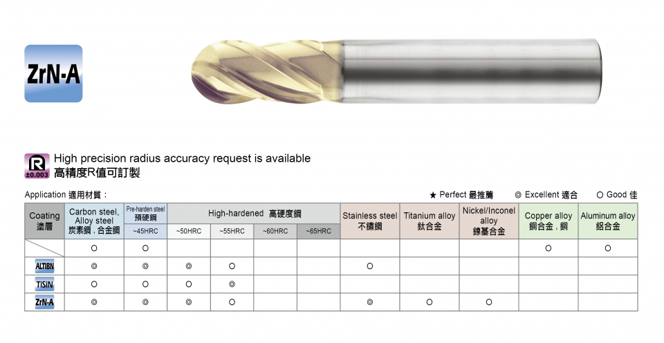 600PLUS High Efficient End Mills Series, Diameter:1mm~20mm, Coating:Uncoated / ALTIBN / TiSiN / ZrN-A(Zirconia + AlTiBN)